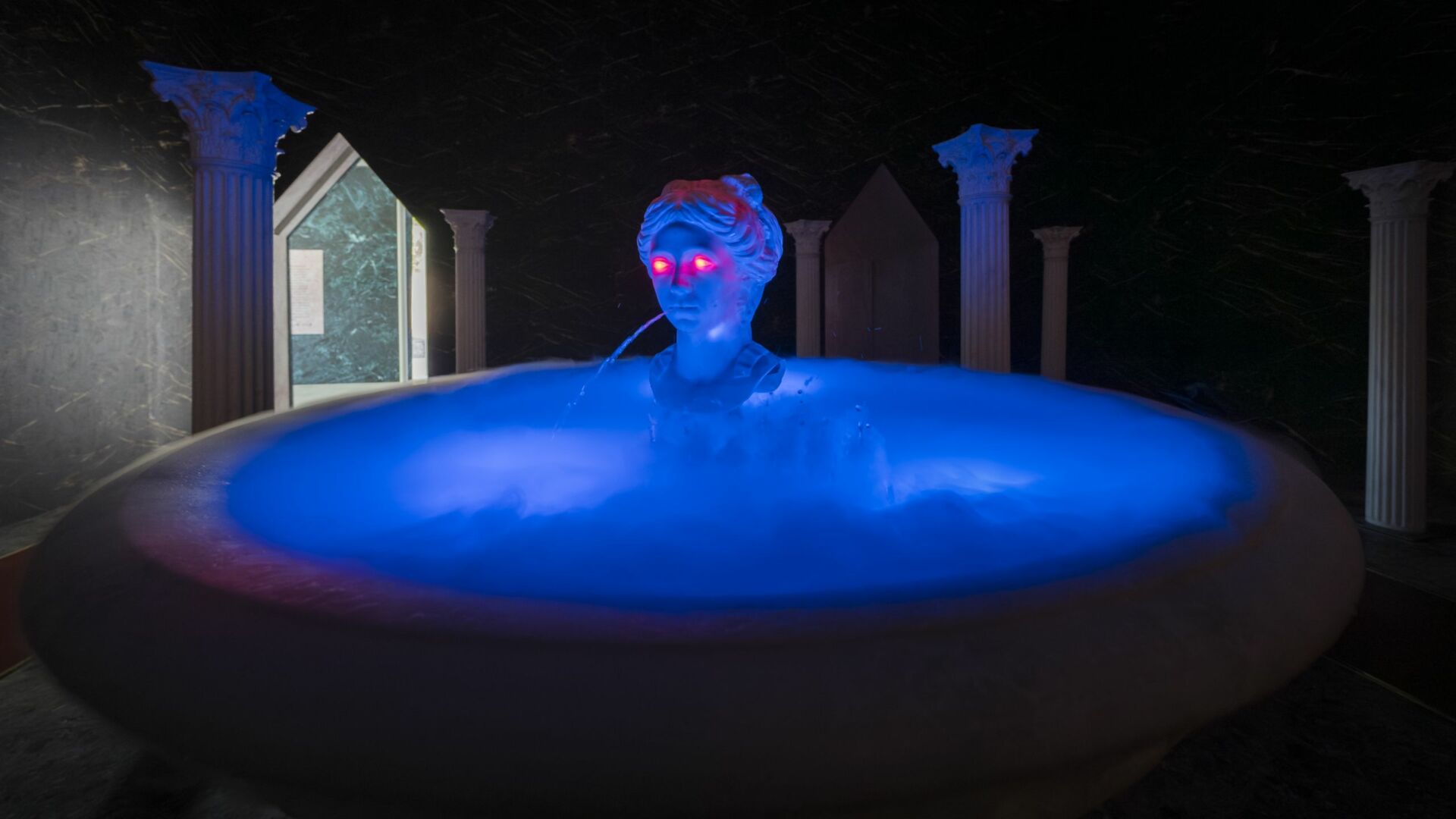 Nella seconda opera e ultimo capitolo della saga, l’installazione intitolata Roma Talismano, la protagonista è la cantante e artista brasiliana Ventura Profana nelle vesti della lupa capitolina – entità allegorica della civiltà romana e simbolo della sua presunta superiorità morale, politica e culturale – presente in forma di ologramma e circondata da un enorme collage che decostruisce l’immaginario visivo del mondo occidentale, insinuando una sensazione di disagio, quasi di timore, all’interno di un contesto familiare. Secondo Guerreiro do Divino Amor, la Roma antica e la Svizzera moderna “costituiscono le fondamenta della presunta superiorità della cultura occidentale”, e per provare a raccontare fenomeni di grandezza cosmica, l’artista si serve della tecnologia per trasformare immagini ordinarie in fantascienza. “Uso la tecnologia in modo artigianale”, spiega: “Le mie opere sono un insieme di high e low tech, così da creare quello stesso sentimento di disillusione che trasmettono”.