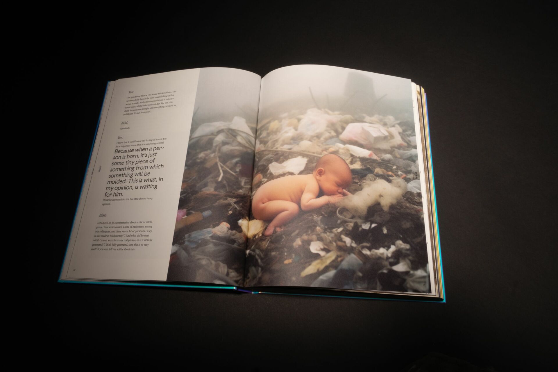 Per Yan Yugay, fotografo professionista, questa è stata la prima esperienza di creazione di una serie basata sull’ AI, ed è proprio la sua esperienza nel campo della fotografia a rendere questa serie unica: non c’è un solo dettaglio casuale in termini di composizione, schemi di colore o scelta dei personaggi. A mio parere, questo è il miglior caso di utilizzo dell’ AI come “fotografo” professionista che abbia mai visto finora. Un capitolo quasi interamente dedicato alle tecnologie odierne e alla tutela contro di esse è il quarto capitolo Brave New World. Si tratta di un’intervista ad Anton Bundenko. è questo il capitolo illustrato dal maggior numero di immagini generate, tra cui una serie molto brillante di Zhenya Filatova, The Alien Among Us.