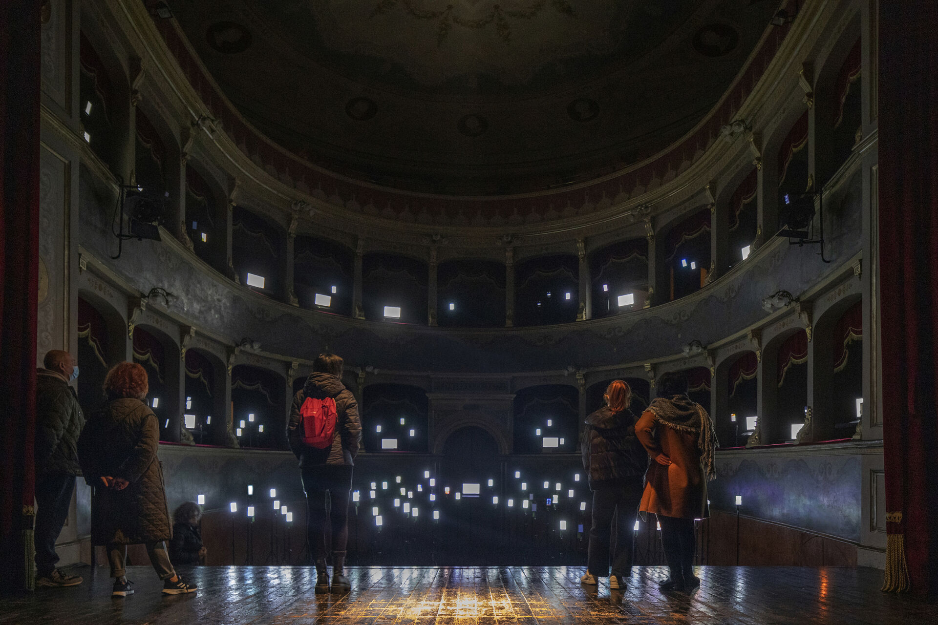 La prima messa in atto di Vainglory si è svolta nel dicembre 2021 all’interno dello storico teatro Petrella di Longiano, nella provincia di Forlì-Cesena. Qui un’orchestra costituita da centocinquanta telefoni e duecentoventi laptop, per i quali Magaldi aveva selezionato centosettanta contenuti diversi, scaricati dai social, in cui gli utenti eseguivano diverse azioni (chi ballava, chi preparava ricette, chi mostrava tutorial, etc.), illuminava e sonorizzava lo spazio pubblico, mentre i contenuti social manipolati dall’artista, diventano la colonna sonora. In questo modo il ruolo degli spazi teatrali veniva ribaltato: il pubblico diventava il vero protagonista dell’opera, mentre il palcoscenico restava vuoto. “Durante la performance, le persone arrivavano dal retro – racconta l’artista – mentre pian piano si accendevano i vari device, che andavano a illuminare la platea e la balconata. Il senso dell’installazione è mostrare – continua – come le masse non siano più formate da soggetti passivi ma da creator sempre attivi: oggi il pubblico produce compulsivamente contenuti di qualsiasi tipo. Per la prima volta nella storia dell’umanità, ci troviamo in un periodo storico in cui le persone si raccontano da sole o si illudono di raccontarsi. Siamo nell’era dell’auto-narrazione. Apparentemente, non c’è più bisogno dell’artista che racconta la società perché è questa a raccontarsi da sola”.