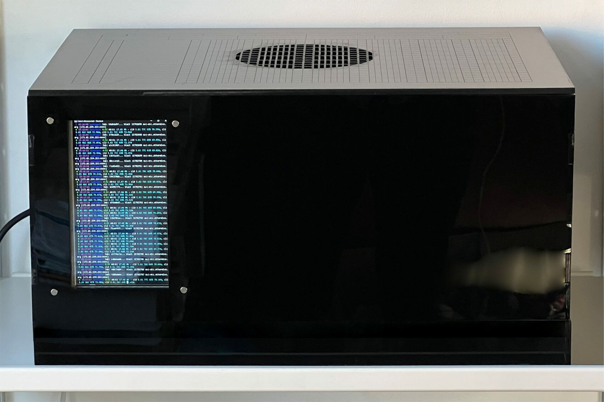 Final Miner è l’ultimo di una trilogia di sculture per il mining di criptovalute che abbiamo realizzato a partire dal 2018. Da quando è avvenuto “The Merge“, Final Miner è diventato un oggetto inerte su uno scaffale di Banner Repeater. Il display del computer, che trasmetteva una sequenza di hash per il mining è spento, e la custodia in acrilico nero funge da urna per le componenti hardware. Ora che l’opera non svolge più la sua funzione originale, il suo valore si è trasformato da pratico a puramente simbolico. Pertanto, resta da determinare se l’obsolescenza funzionale di Final Miner avrà un impatto positivo o negativo sul suo valore di mercato.