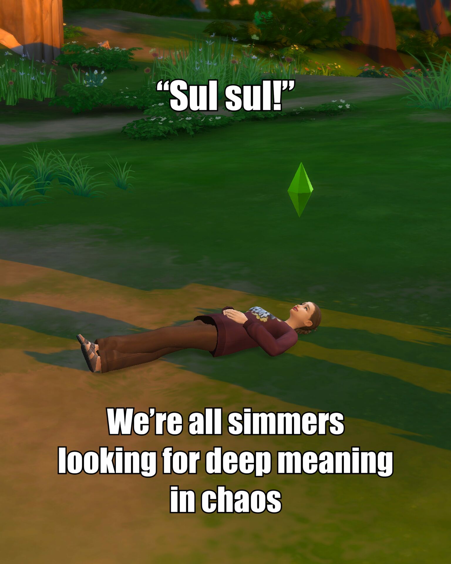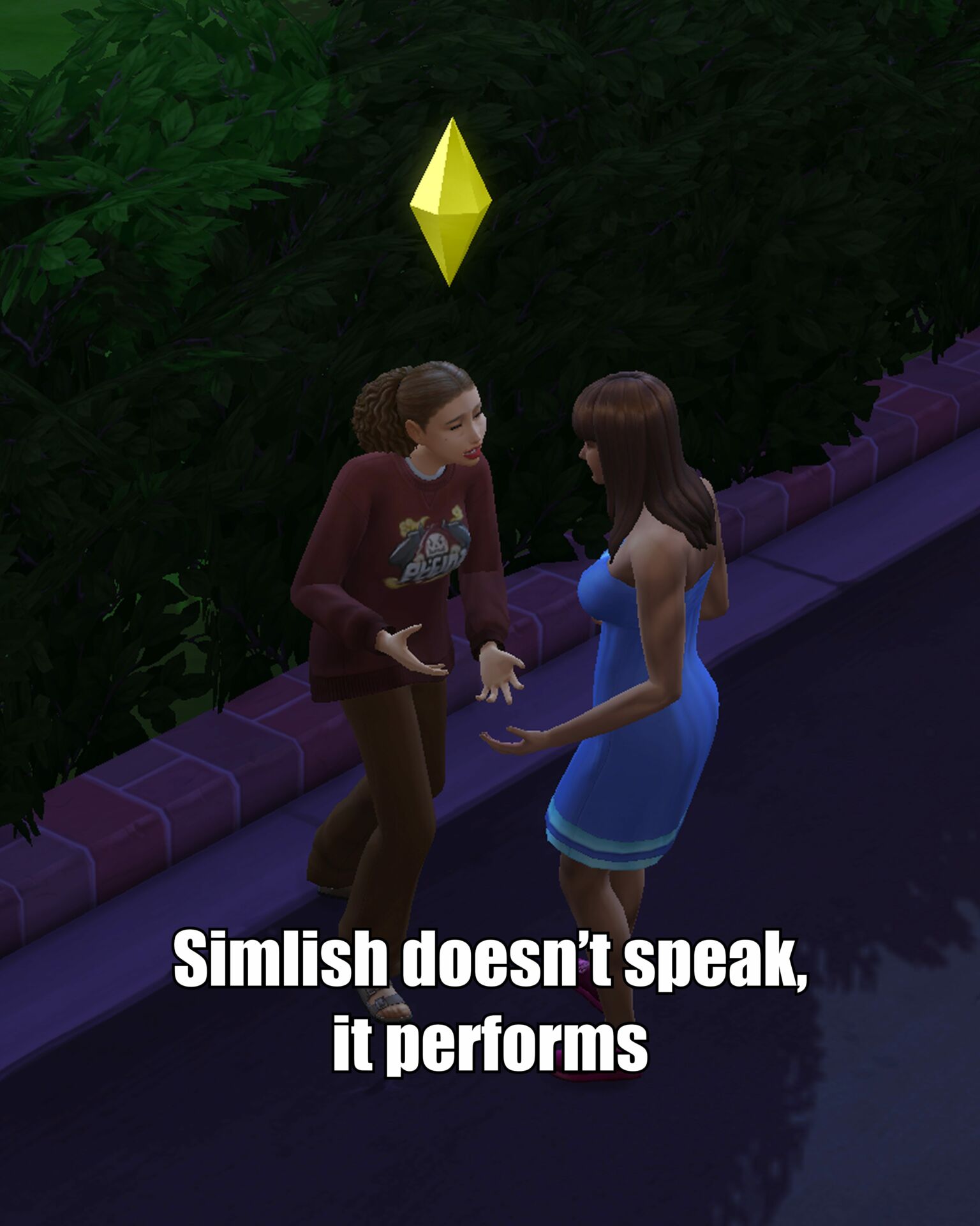 è un linguaggio performativo. Il Simlish si propone come un dispositivo linguistico che affonda le radici in una tensione post-linguistica radicale. La sua artificialità non è un limite, ma una risorsa, un gesto estetico che richiama le istanze della scrittura asemica. In questa zona grigia tra codice e caos, il Simlish non tenta di “dire”, ma di evocare, di stimolare una reazione affettiva e interpretativa. In questo senso, si inserisce nelle riflessioni post-strutturaliste sulla morte dell’autore e sulla crisi del significato stabile: ogni enunciato in Simlish è simultaneamente universale e irripetibile, perché dipende interamente dal contesto, dalla gestualità, dall’intonazione e, soprattutto, dall’occhio del giocatore che assiste. Non è un linguaggio che rappresenta il mondo, ma uno che lo reinventa. Questa condizione apre uno spazio di riflessione ulteriore sulla soggettività dell’utente. Se l’avatar funziona come uno specchio digitale, un doppio che non restituisce fedelmente l’immagine ma la distorce, allora la relazione tra giocatore e personaggio si gioca tutta sul filo del riconoscimento. Ogni emozione che l’utente proietta sul Sim è sempre un’operazione speculare e differita, un desiderio vestito da finzione, un’identità esplorata attraverso una simulazione. Il linguaggio diventa qui una lente opaca: invece di mostrare chiaramente, lascia intravedere, trasforma ogni interpretazione in un atto creativo. Il Simlish non è quindi un ostacolo alla comunicazione, ma il suo catalizzatore più radicale, perché impone uno sforzo di immaginazione continua.