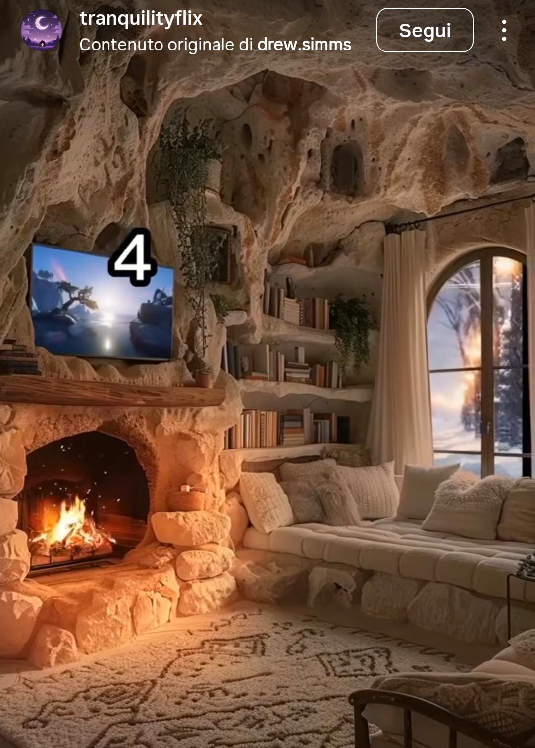 I video di cui scrivo si distinguono perché sono come un personality test molto basilare, in cui viene solo chiesto di scegliere senza che poi ne consegua una risposta: “Se conosci bene il tuo fidanzato quale di queste case preferisce?” , “Ti devi isolare per un anno, che casa scegli?” o ancora “Non dormi da due giorni, in quale di questi letti ti riposi?” Le immagini che seguono sono generate con L’AI e numerate in modo da poter scegliere. Rappresentano case immerse in paesaggi diversi che corrispondono a clichés ben precisi : il deserto, la giungla, una montagna innevata, un bosco, una grande metropoli. Lo stesso vale per gli interni, che esaltano l’idea di comfort assoluto con decine di cuscini, maxi schermi, caminetti accesi quando fuori c’è il temporale. Li definirei degli ASMR visivi che mostrano le pagine di un catalogo di arredamento di un’altra dimensione.