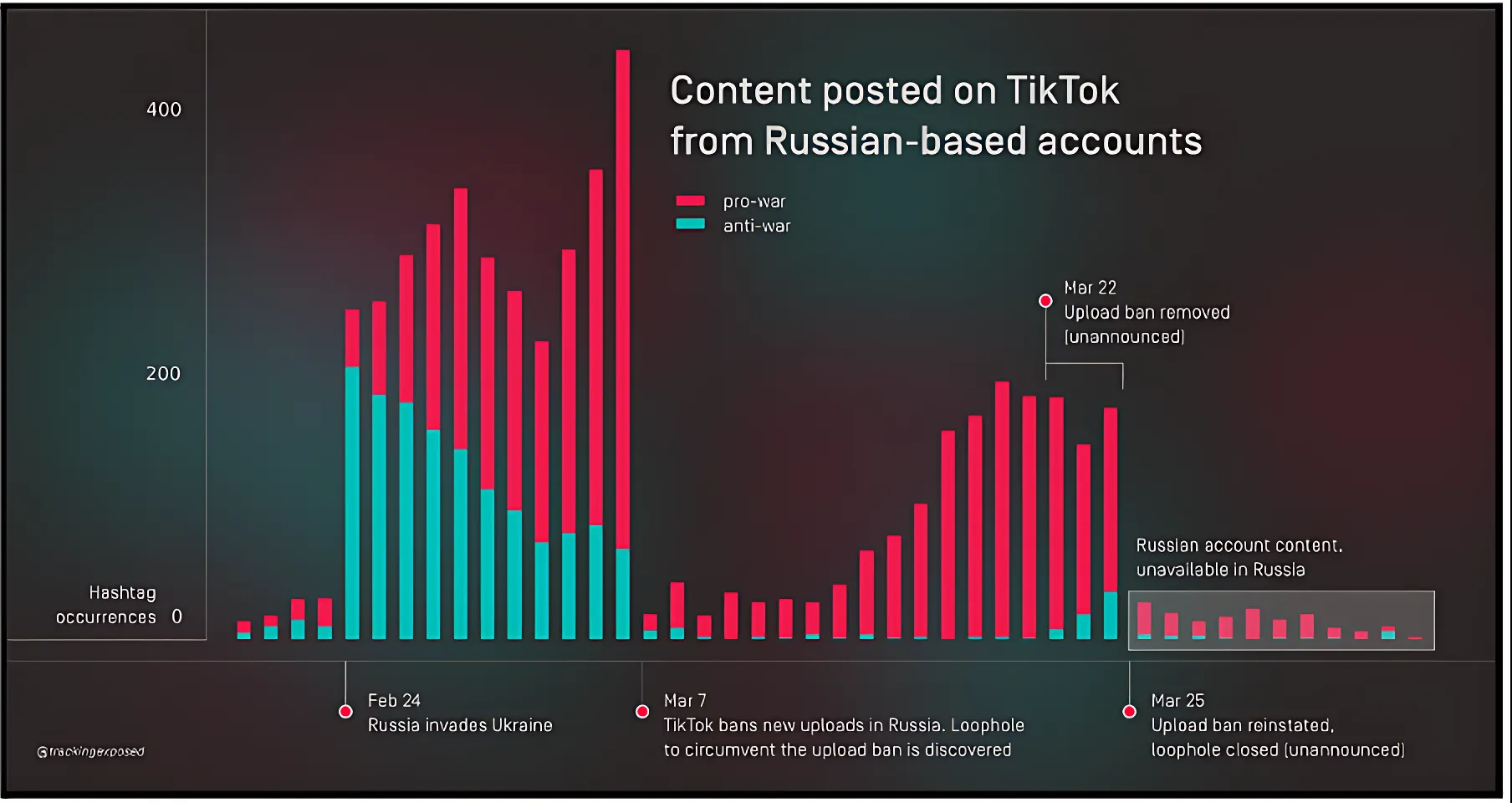 Returning to the Ukraine invasion: while it’s easy for TikTok to block certain keywords and demonstrate compliance with state demands, users can often find ways around the blocks. For instance, if an influencer posted a video dancing with a sign saying “Stop the War,” without hashtags or using the word “war” in the description, it would be challenging for TikTok to remove it automatically. Intervention would only occur after the video garnered thousands of views, making censorship attempts obvious and triggering the so-called “Streisand Effect” (look it up on Wikipedia!). TikTok’s response to this situation was unprecedented. They geographically fragmented their network, preventing Russian citizens from uploading videos and rendering all non-Russian profiles invisible.
