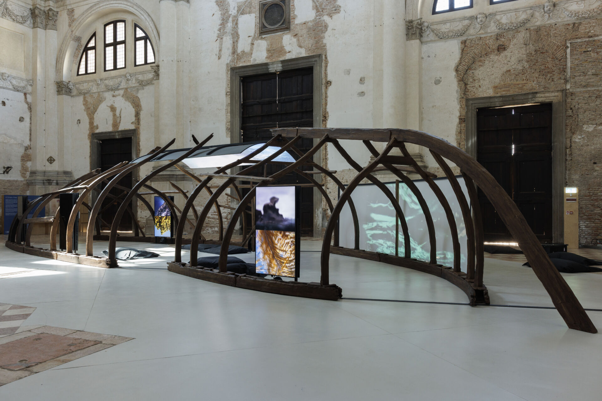 Two Caribbean artists, Nadia Huggins and Tessa Mars, transform the historic church of San Lorenzo into a sensory immersion of video, painting and sound. Curated by Yina Jiménez Suriel for the tenth anniversary of The Current (TBA21Academy), the exhibition abandons the terrestrial perspective to embrace the ocean as a space of freedom, metamorphosis and resistance.