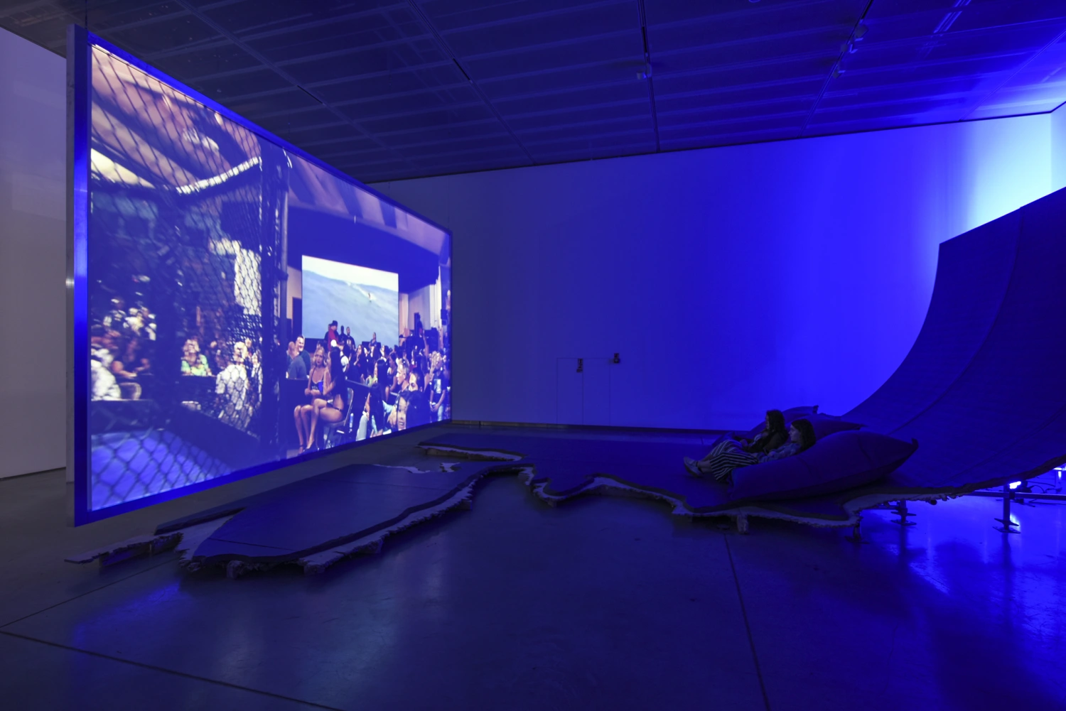 È il caso di Hito Steyerl, che con Liquidity Inc. (2014) affronta la natura sfuggente e interconnessa dei sistemi globali. La video-installazione mostra la storia di Jacob Wood, analista finanziario che, dopo aver perso il lavoro nel crollo del 2008, diventa lottatore di arti marziali miste. Con onde generate al computer e immagini di uragani, l’opera usa l’acqua e il meteo estremo come metafore della fluidità dei beni finanziari, delle informazioni digitali e dell’instabilità collettiva: il concetto di “liquidità” descrive l’instabilità delle economie globali e delle trasformazioni ambientali, presentandole come iperoggetti che non possono essere contenuti o spiegati da narrazioni lineari. Così, l’opera diventa una riflessione su come la tecnologia digitale possa simulare l’esperienza di trovarsi immersi in sistemi troppo grandi per essere compresi.